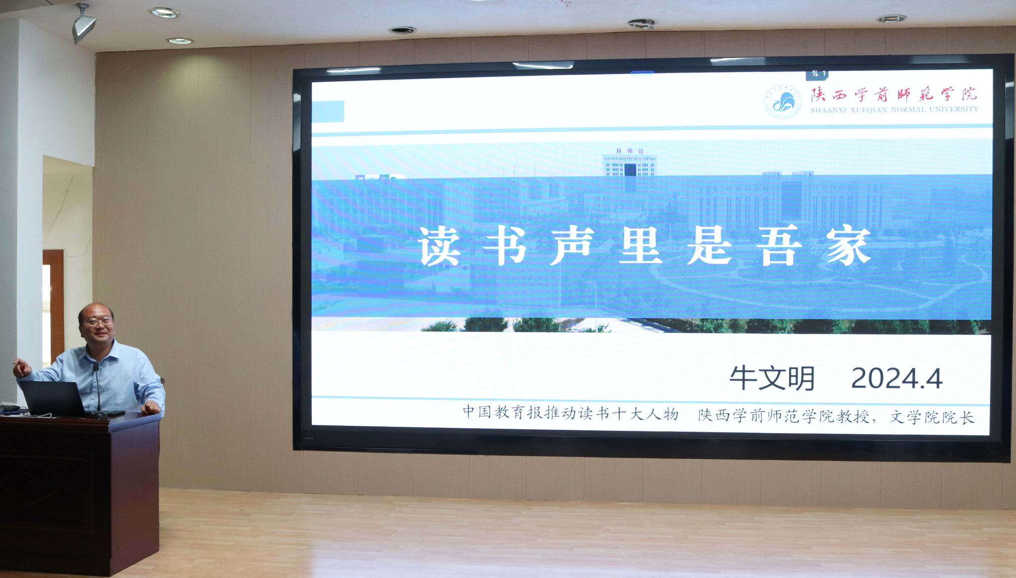 4月26日下午,陕西学前师范学院文学院院长牛文明教授应邀来我校为澳门网投唯一官网2023级学生做了“读书声里是吾家”的专题读书报告。本次报告由澳门网投唯一官网院长杨运庚主持。