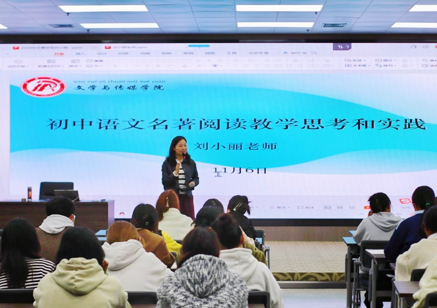 2024年11月6日,澳门网投唯一官网第四届“中学语文卓越师资班”第二场学术活动成功举行,本次讲座特邀陕西省语文教学名师刘小丽开展了以“初中语文名著阅读教学思考和实践”的专题讲座活动,班主任唐明珍和师资班全体学生聆听了本场讲座。