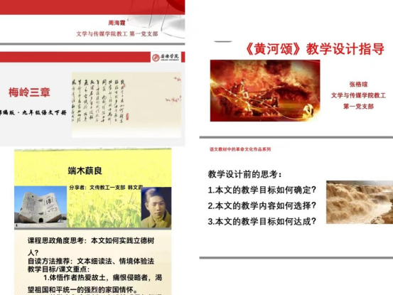 9月份张格瑄、周海霞、韩文霞三位同志分别从对学生进行教学指导、教学设计及课程思政角度为大家解读了《黄河颂》、《梅岭三章》、《土地的誓言》。张格瑄同志认为语文课不能上成政治课,革命文化的渗透要体现在字里行间的赏析品读和感悟体会中;通过周海霞同志的分享,大家再次学习了陈毅同志为革命献身的凛然正气、视死如归的壮烈情怀和对革命胜利的坚定乐观信念;韩文霞同志解读的《土地的誓言》让大家在体会“小我”对故乡感情的同时,也感受到了“大我”的国家情怀。