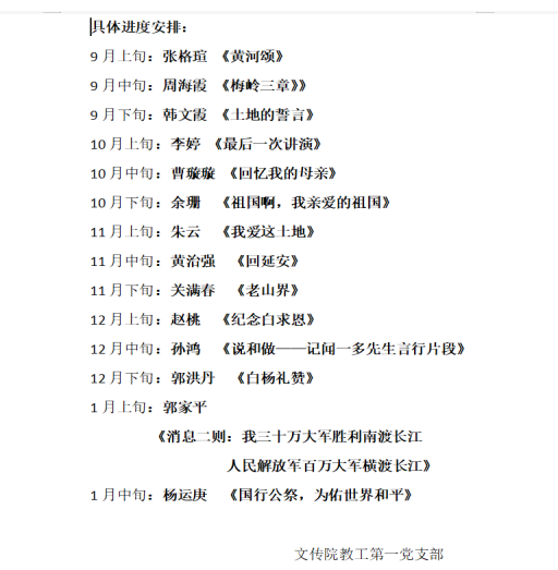 10月份由李婷、曹璇璇、余珊三位同志进行文本解读分享。李婷同志解读的《最后一次演讲》让同志们看到了闻一多先生的光辉形象,也让同志们明白虽然英雄已逝,但英雄的精神永在。生长于和平年代的我们,同样需要探求真理的意志,同样需要家国的情怀。曹璇璇同志分享的《回忆我的母亲》不仅让大家认识了一位拥有勤劳俭朴、宽厚仁德、坚强不屈等优良品质的母亲,还让大家进一步了解了忠于人民、忠于民族、忠于党的无产阶级革命家朱德同志。余珊同志分享的《祖国啊,我亲爱的祖国》让同志们看到了当时祖国的贫穷落后,也深刻感受到了作者舒婷对祖国的无比热爱、无限期盼和献身决心。