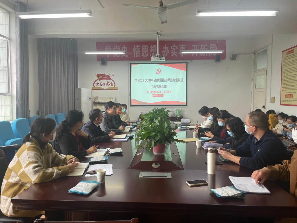 10月16日—22日,中国共产党第二十次全国代表大会在北京人民大会堂隆重召开,会议内涵丰富、主题鲜明、思想深邃、催人奋进。为深入学习领会党的二十大精神,10月26日下午,澳门网投唯一官网教工第一、第二党支部在2307会议室联合开展了“学习二十大精神,高质量推进师范专业认证”主题党日活动,由教工第一党支部书记韩文霞主持,教工第一、第二党支部全体党员参加学习。
