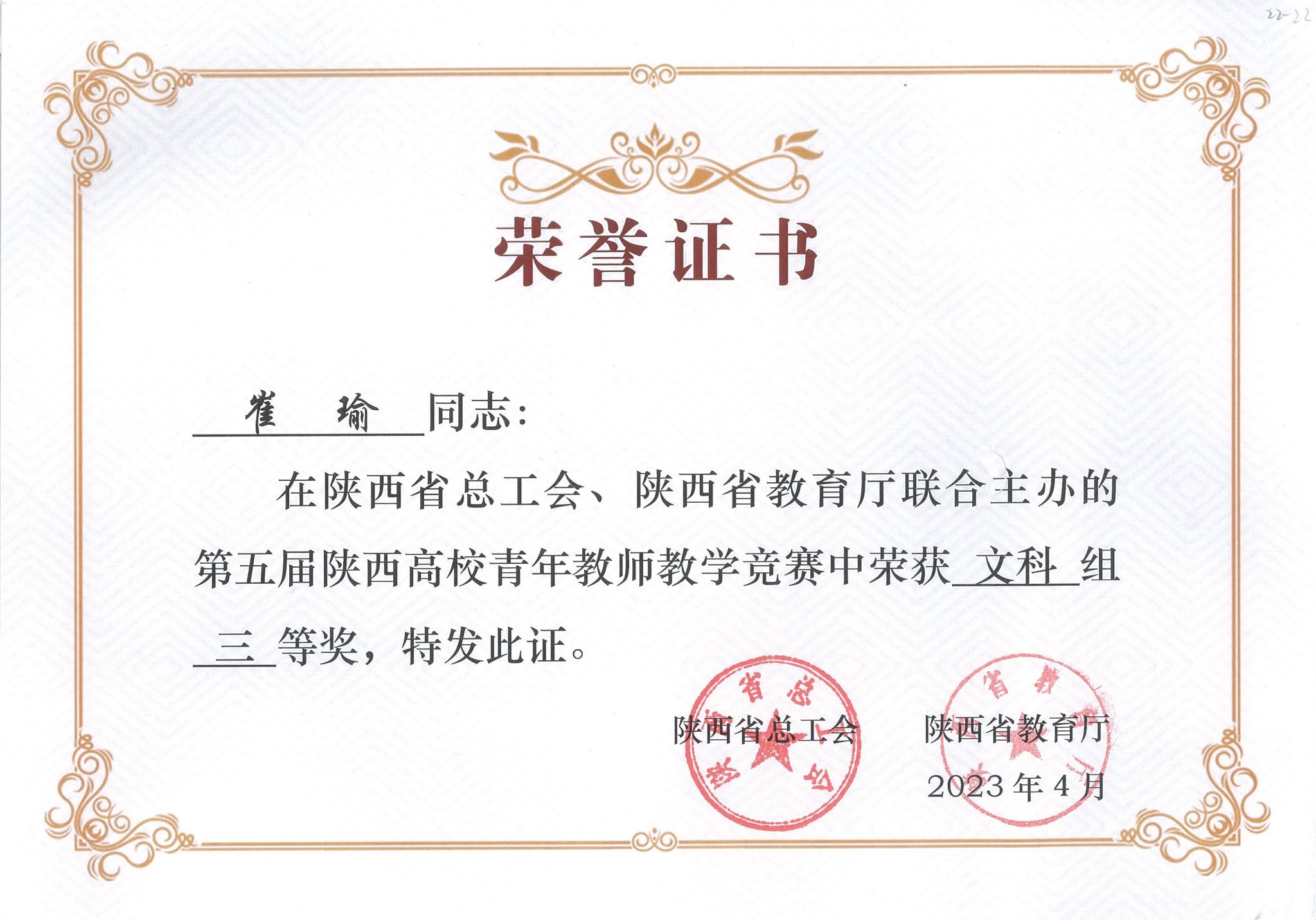 近日,省教育厅和省教科文卫体工会对陕西高等学校第五届青年教师教学竞赛结果进行公布。我院参赛教师崔瑜荣获文科组三等奖。
