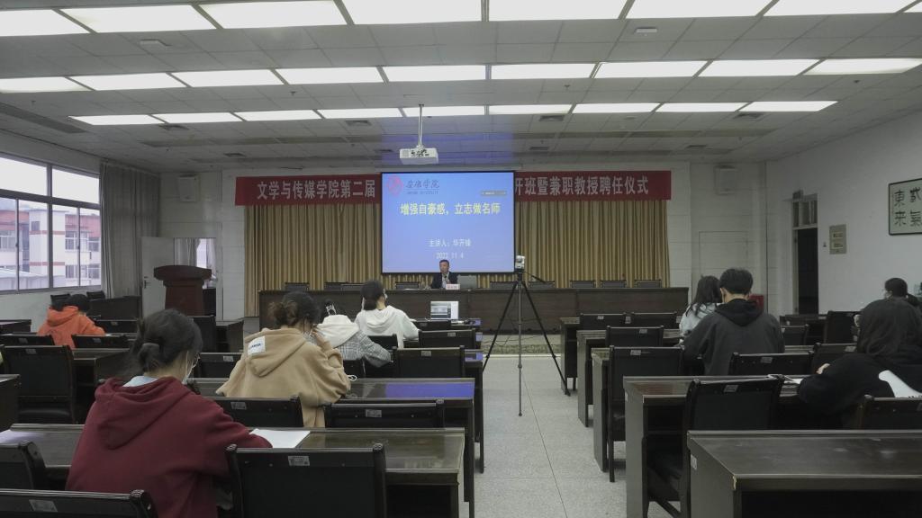 2022年11月4日下午三点半,优秀校友、陕西省首批基础教育名师、特级教师华开锋应邀为澳门网投第二届中学语文卓越师资班做了题为“增强自豪感,立志做名师”的首场学术报告。澳门网投唯一官网副院长朱云、卓越师资班班主任张格瑄和三个会场132名同学共同聆听了本场讲座。