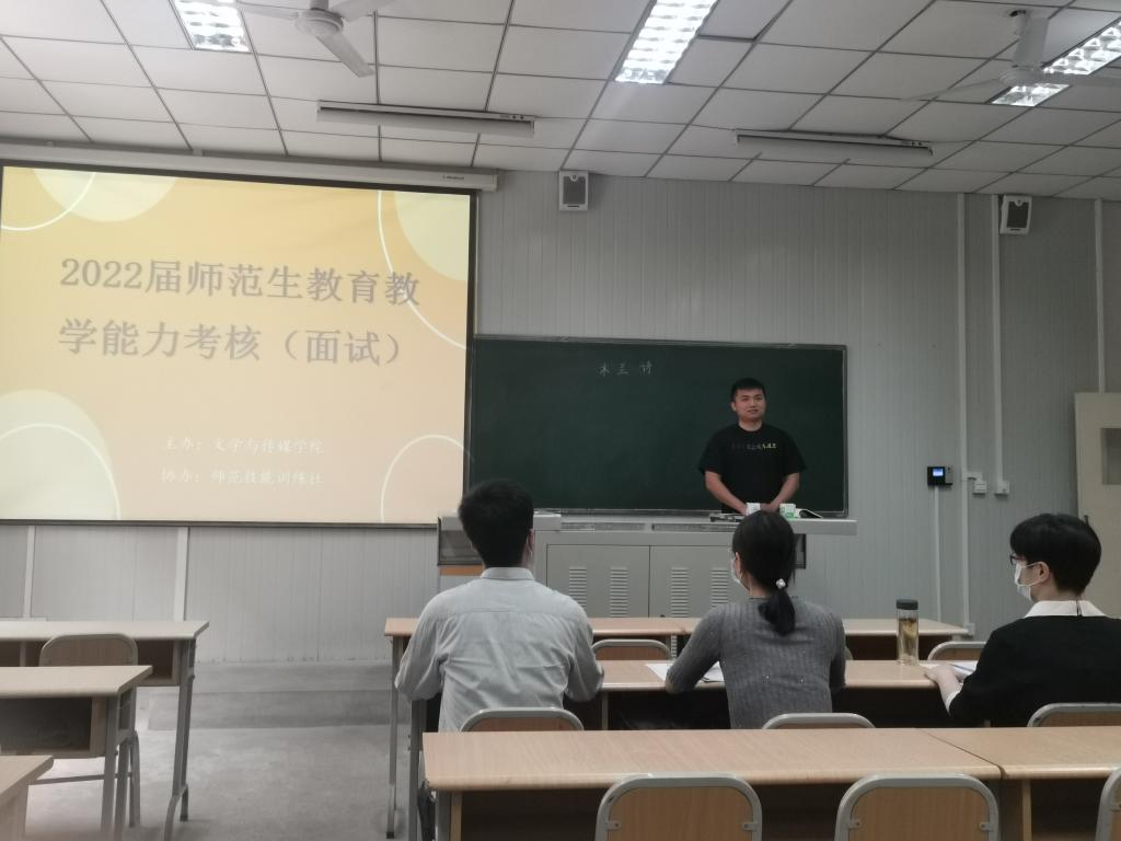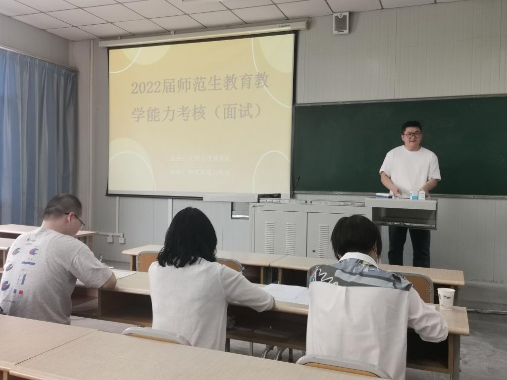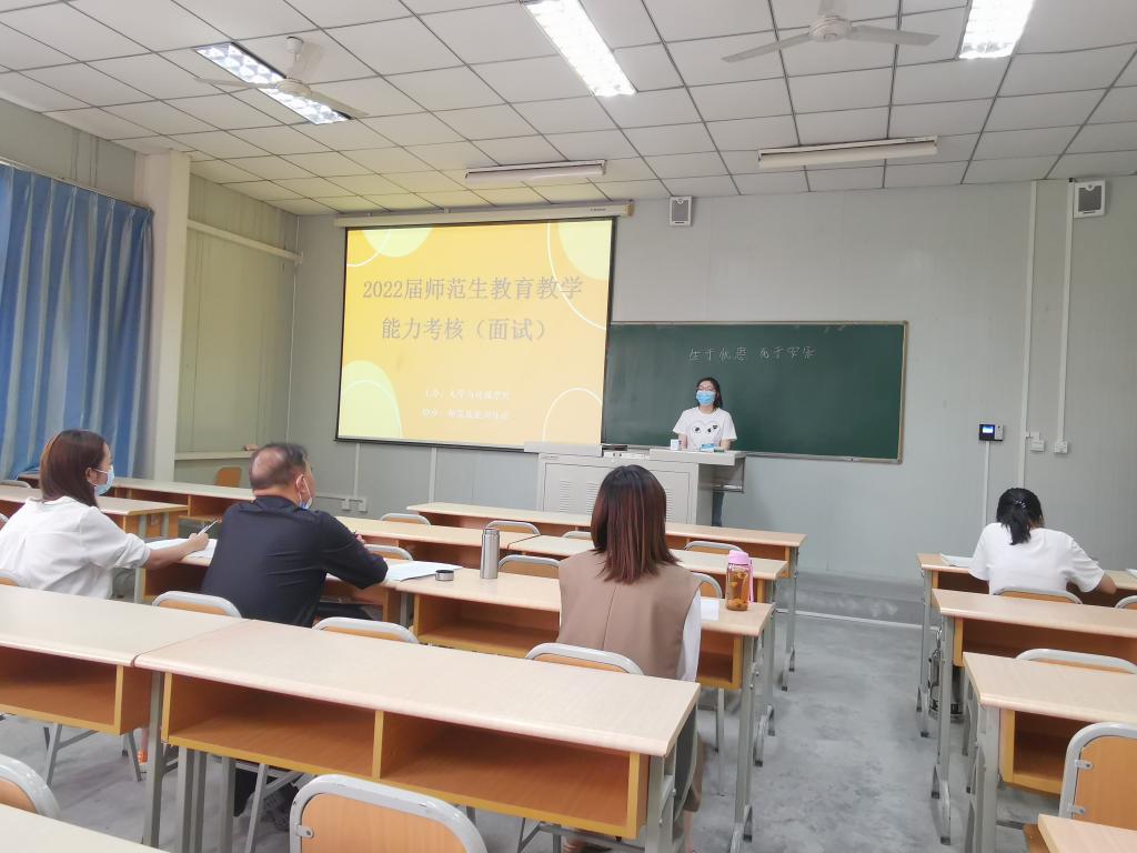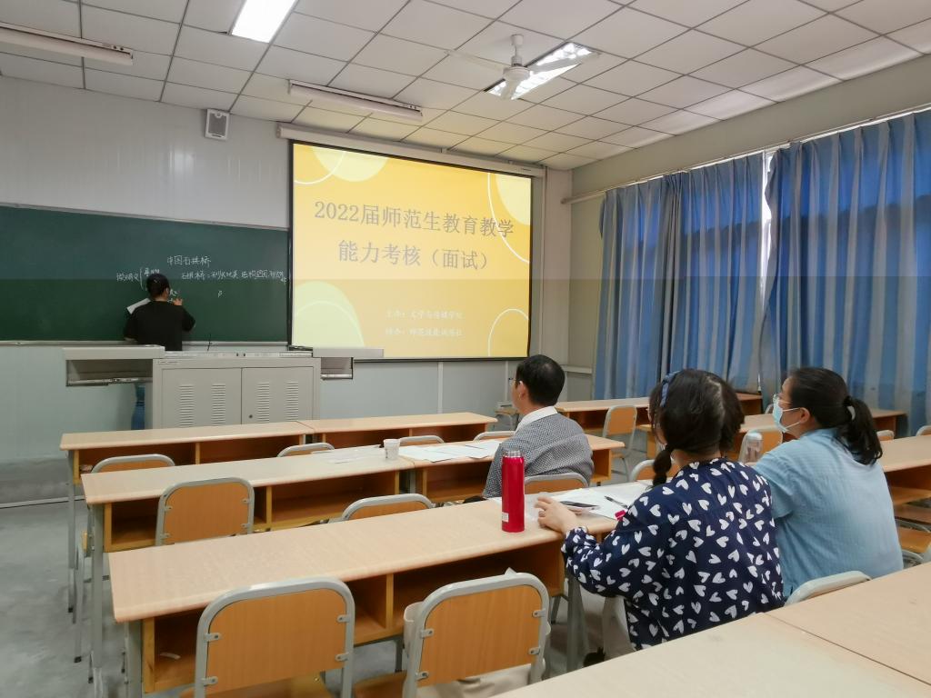 2022年5月8日—9日,澳门网投唯一官网在江南校区十号教学楼组织了2022届师范生教育教学能力考核(面试)工作。本次面试考核由学院师范技能训练社承办,特聘安康市教研室耿良富、邱俊,汉滨区教研室李玉恒,张滩高中汪嘉雯以及学院八位教师担任考官。