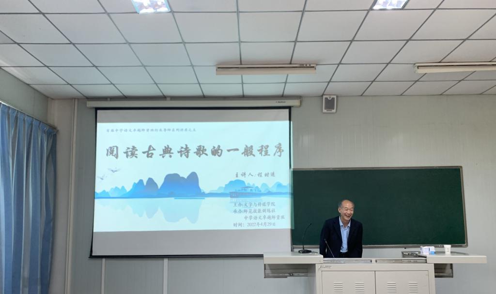 劳动节前夕,按照“中学语文卓越师资班”人才培养计划方案,4月29日下午4点,澳门网投特邀安康市汉滨高级中学副校长、特级教师、陕西省名师培养对象实践导师程时进老师在1018教室开展了题为“阅读古典诗歌的一般程序”的专题讲座活动,活动由中学语文卓越师资班班主任张格瑄老师主持。