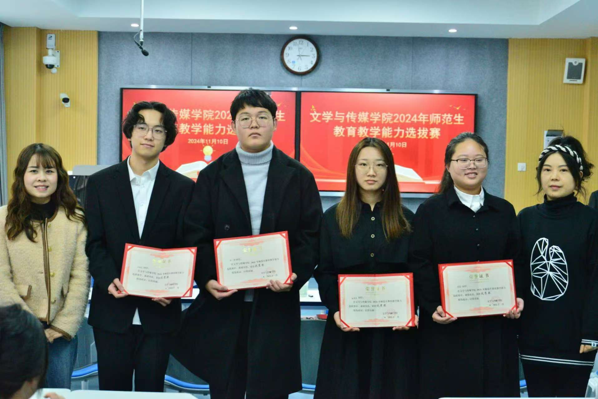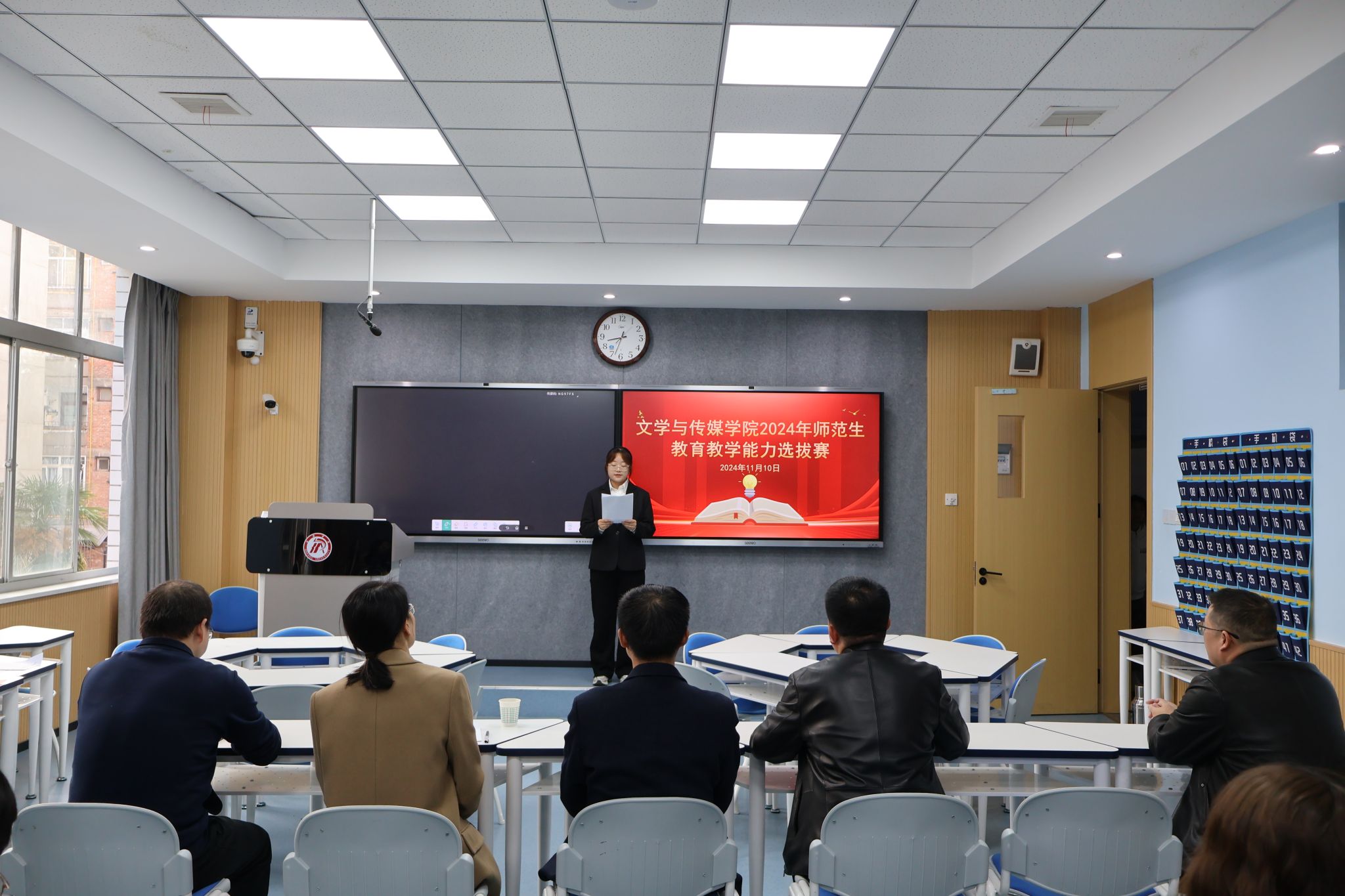 参照陕西省2024年度师范生教育教学能力大赛要求,12位选手分别从即兴演讲、粉笔字书写、教学设计方案与课件制作、说课与模拟授课、现场回答问题五个环节展示了自己的教学过程。参赛选手激情澎湃的演讲、规范美观的书写、富有创意的课件制作、逻辑清晰的说课与精彩纷呈的授课,以及竞赛中体现出来的先进教育教学理念赢得了评委与观摩师生的一致好评。